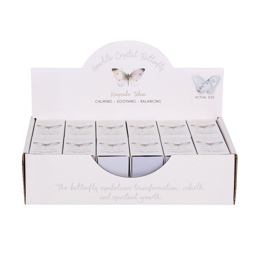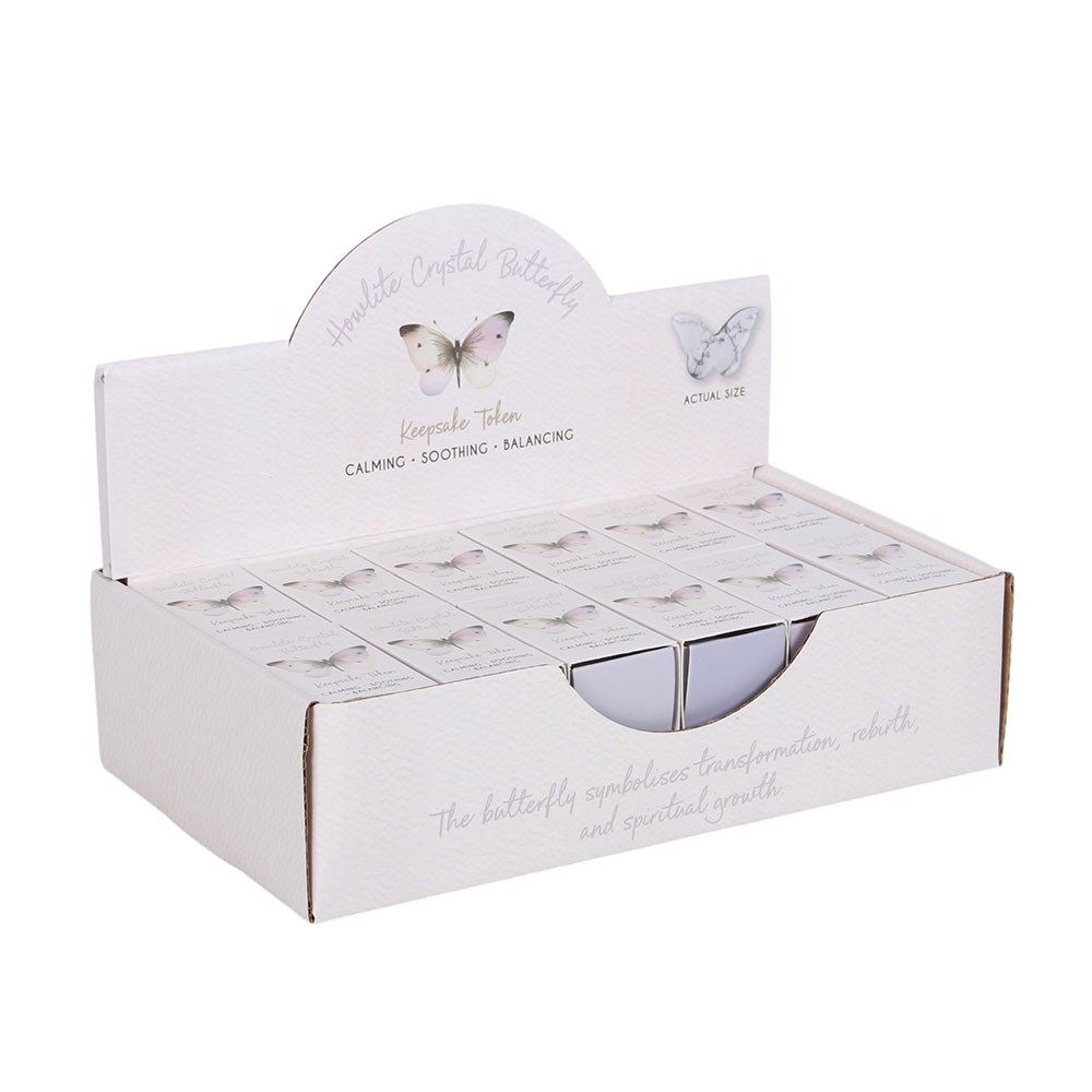 This set includes 24 howlite butterfly keepsake tokens, each presented in a tiny gift box featuring the delicate butterfly image from the White Butterfly collection. Known for its calming and balancing properties, howlite makes a thoughtful token to bring comfort and peace during times of remembrance. Supplied in a cardboard display unit for easy point-of-sale presentation. Designed by Something Different Wholesale and part of the White Butterfly collection of sentimental gifts and home decor.<scribe-shadow id="crxjs-ext" data-crx="okfkdaglfjjjfefdcppliegebpoegaii" style="position: fixed; width: 0px; height: 0px; top: 0px; left: 0px; z-index: 2147483647; overflow: visible; visibility: visible;"></scribe-shadow>