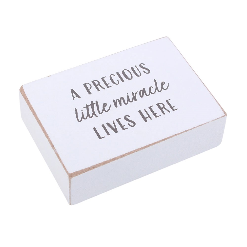 Célébrez les moments les plus précieux de la vie avec cette plaque en bois décorative présentée dans un sac en toile de jute. Ornée de l'inscription touchante « A Precious Little Miracle Lives Here » (Un petit miracle précieux vit ici) sur une plaque en bois blanc, elle constitue un souvenir attentionné pour les nouveaux-nés et les familles qui s'agrandissent. Chaque plaque est soigneusement présentée dans un sac rustique en toile de jute à cordon, noué pour une finition charmante de style champêtre. Idéale comme cadeau pour une fête prénatale, un baptême ou comme touche décorative pour une chambre d’enfant. Vendu à l’unité et par lots de 12.