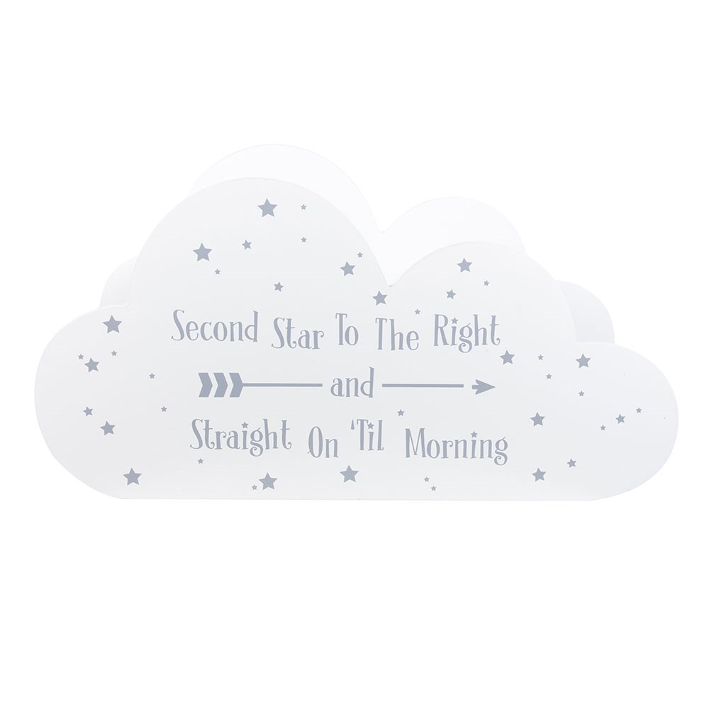 Créez une touche de fantaisie dans la chambre de votre enfant grâce à cette étagère en forme de nuage en bois. De couleur blanche et ornée de délicates étoiles grises, elle arbore sur le devant l'inscription fantaisiste « Second Star to the Right and Straight on Till Morning ». Ingénieusement conçue pour être réversible, elle permet de ranger soigneusement des livres à l'intérieur du nuage, ce qui la rend à la fois décorative et pratique. Idéale pour les chambres d'enfants ou les chambres de bébé, c'est une jolie façon d'exposer les contes préférés du coucher tout en ajoutant une touche douce et féérique à la pièce.