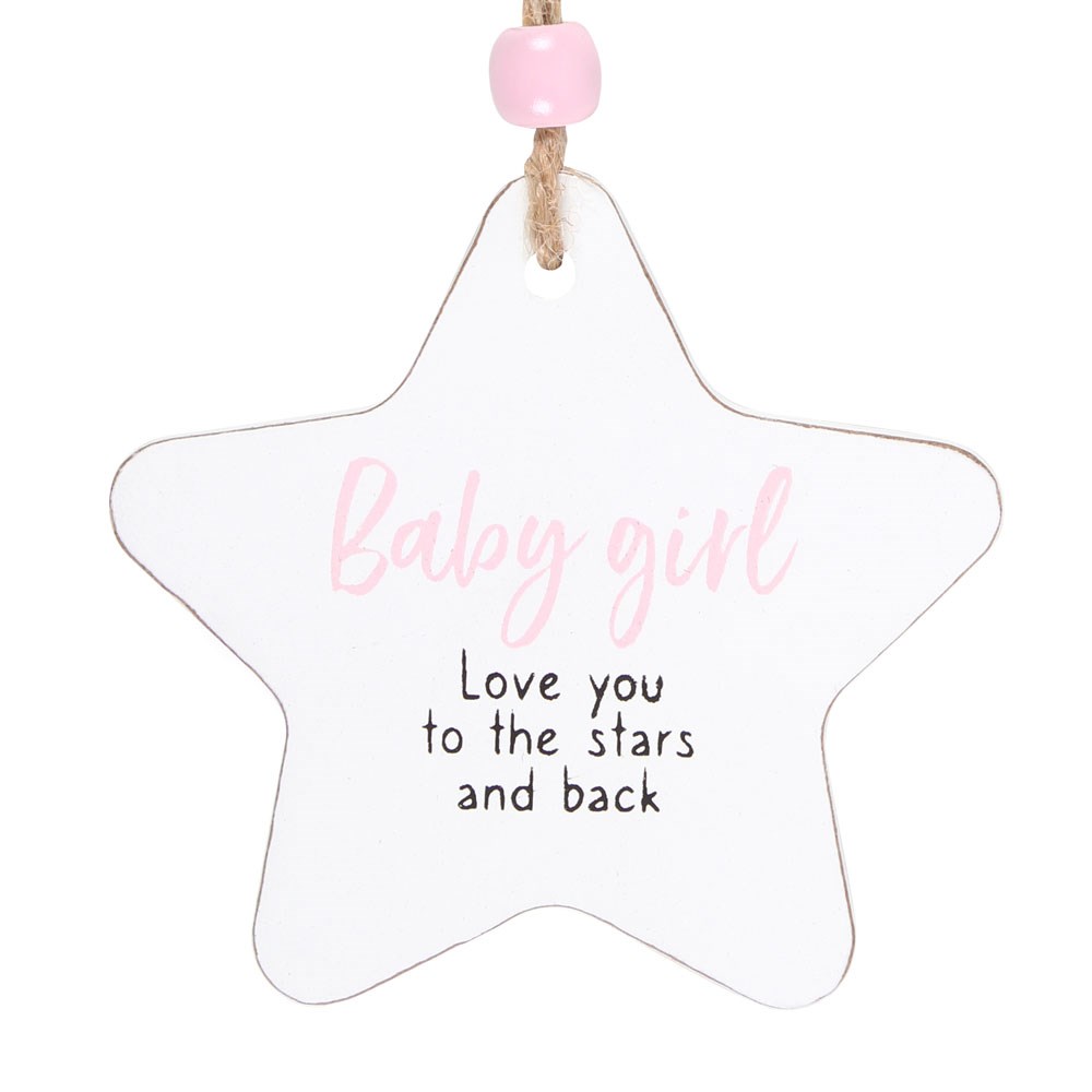 A small star sign perfect for baby showers and celebrating new arrivals. Features text that reads, 'Baby Girl. Love you to the stars and back' and finished with a wooden bead. Designed by Something Different Wholesale and part of the Hanging Sentiment Sign range.