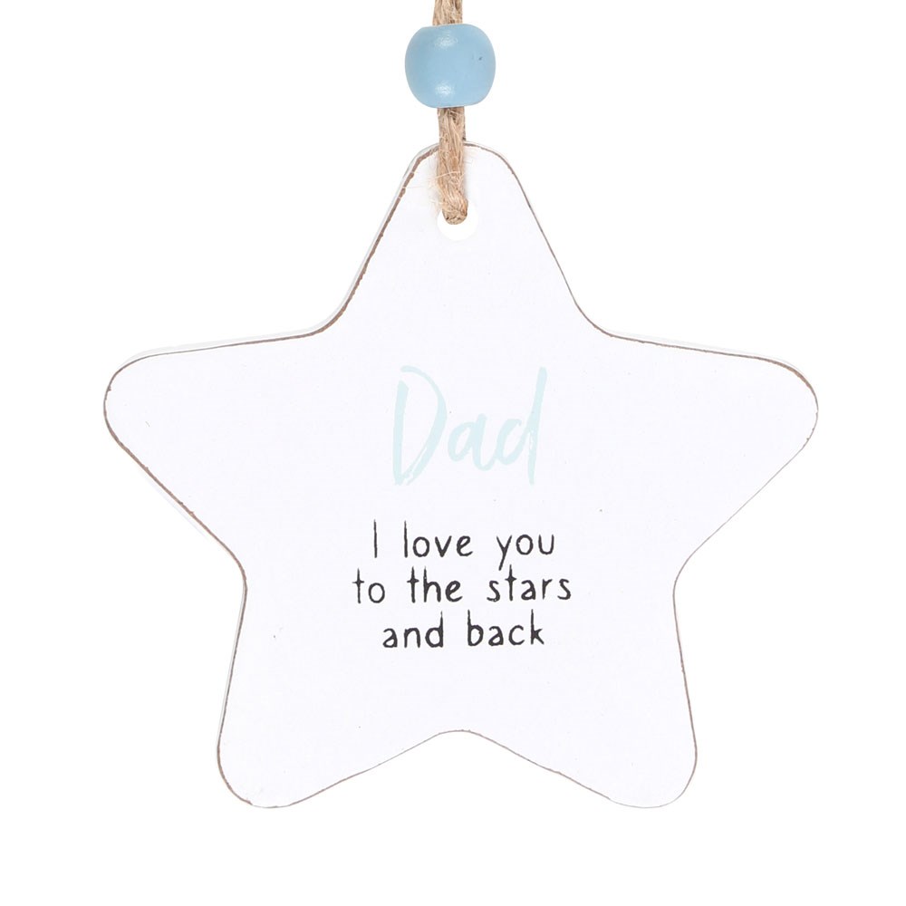 A small star sign perfect for Father's Day, birthdays and other special occasions. Features text that reads, 'Dad, I love you to the stars and back' and finished with a wooden bead. Designed by Something Different Wholesale and part of the Hanging Sentiment Sign range.