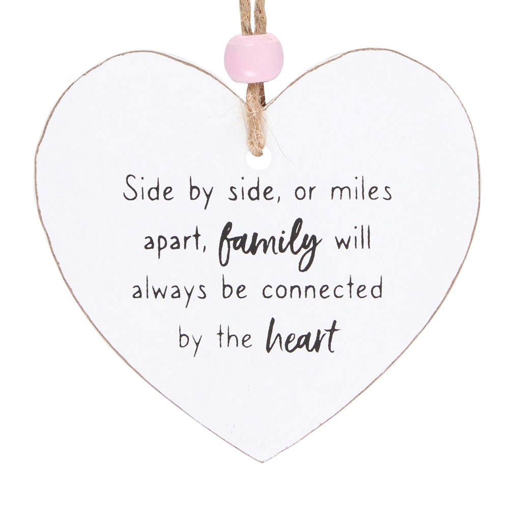 A small heart sign for hanging on wall hooks or adding to a family member's gift with text that reads, ‘Side by side or miles apart, family will always be connected by the heart' and finished with a wooden bead. Designed by Something Different Wholesale and part of the Hanging Sentiment Sign range.