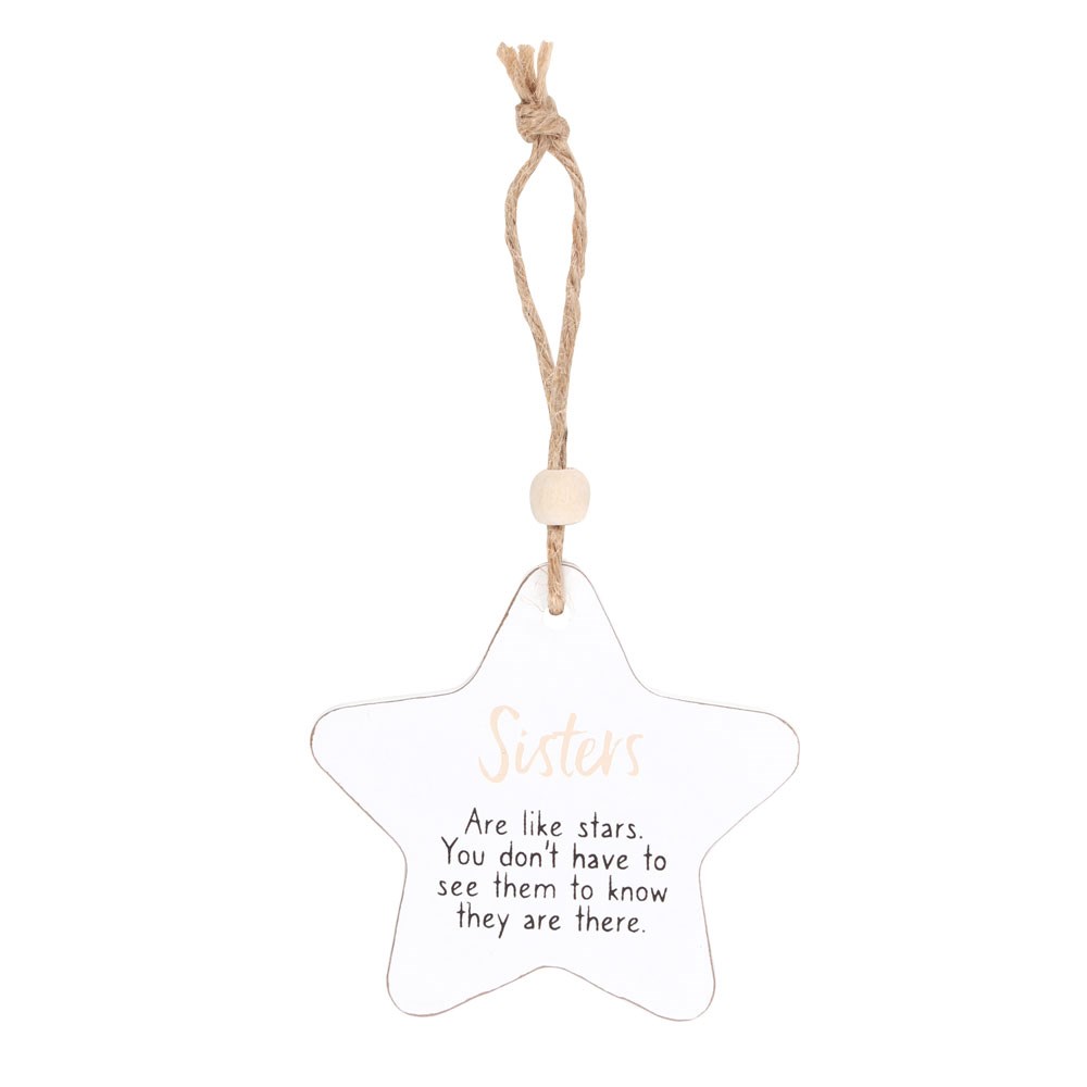 A small star sign perfect for birthdays and other special occasions. Features text that reads, 'Sisters are like stars. You don't have to see them to know they are there' and finished with a wooden bead. Designed by Something Different Wholesale and part of the Hanging Sentiment Sign range.