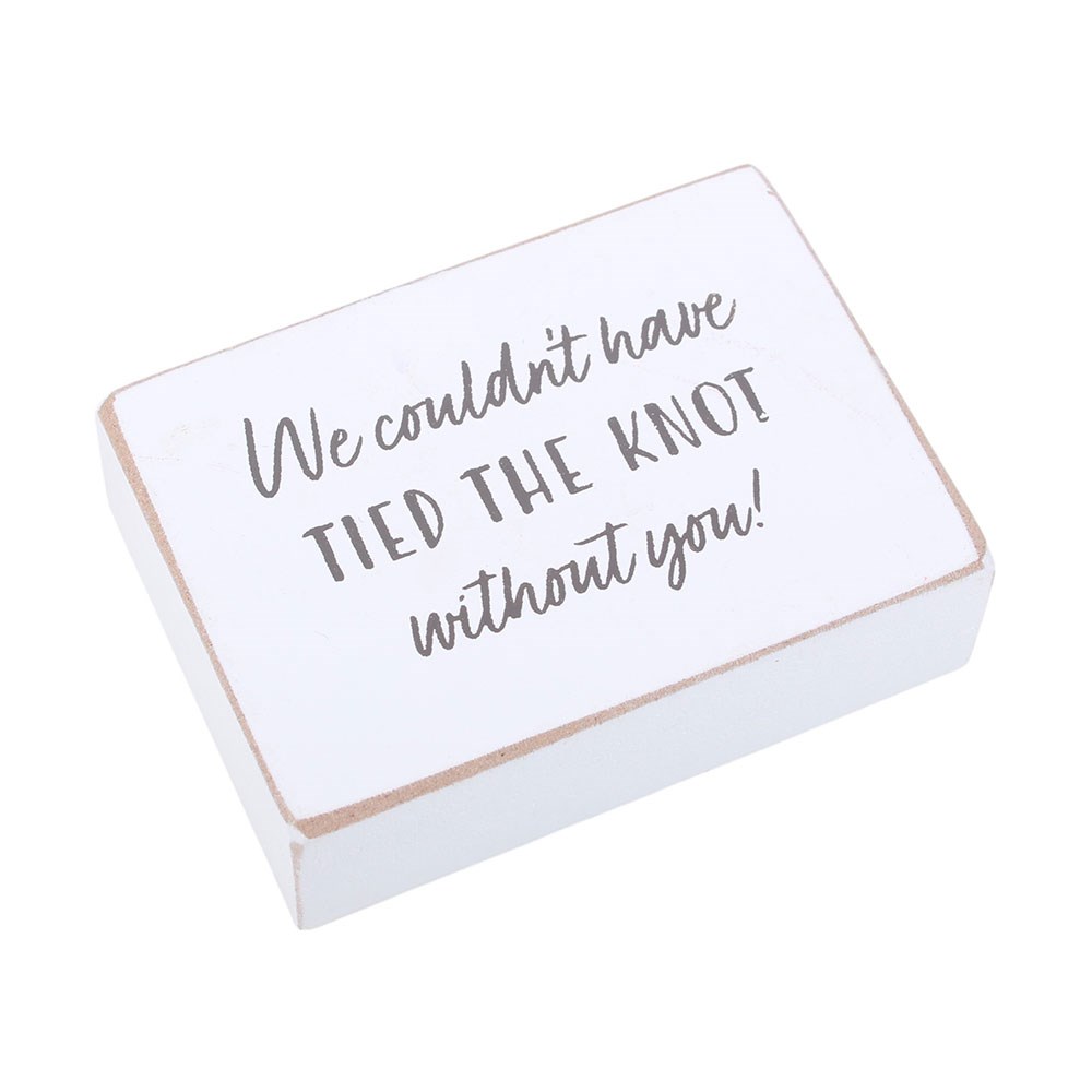 Breng een speciaal bedankje over met dit houten bordje met tekst in een jutezakje. Met de tekst We Couldn’t Have Tied the Knot Without You op een wit houten bordje is dit een attent aandenken voor bruidsmeisjes en -jonkers of dierbare gasten. Elk bordje wordt geleverd in een rustiek jutezakje met trekkoord, dat is dichtgebonden voor een mooie landelijke uitstraling. Perfect voor bruiloften en verlovingsfeesten. Prijs per stuk en verkocht in verpakkingen van 12 stuks.