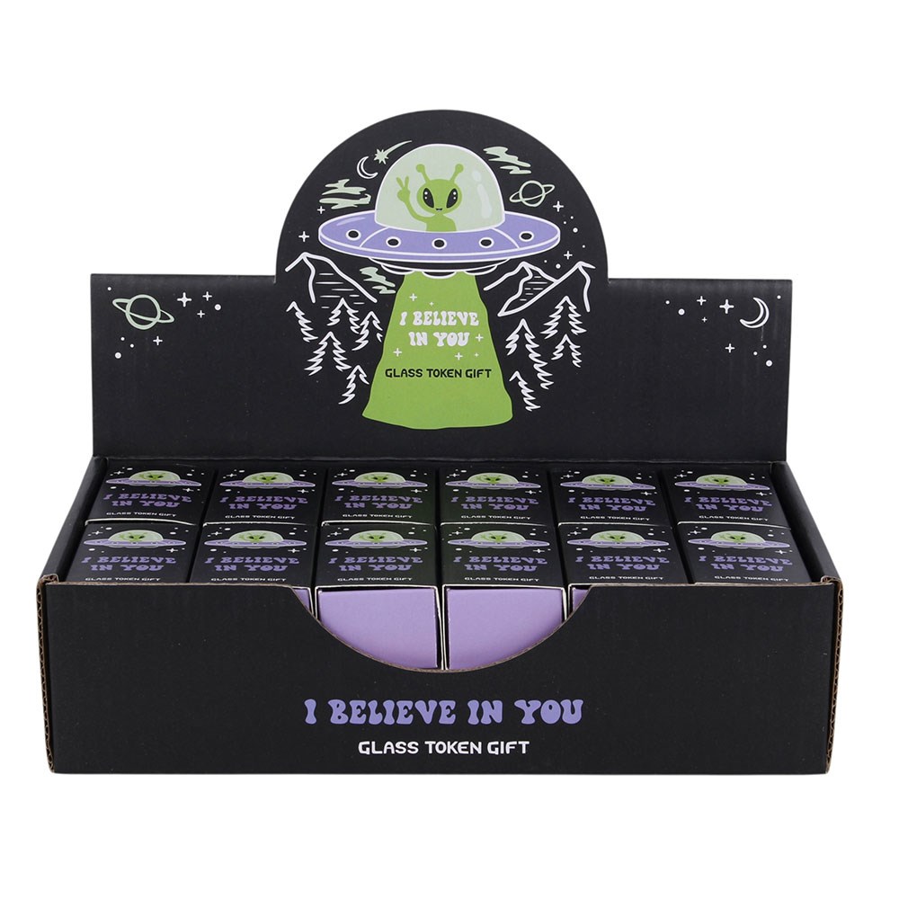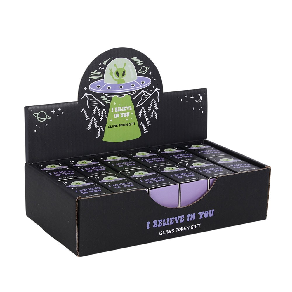 Podaruj małego zielonego przyjaciela komuś, kto potrzebuje kosmicznej dawki energii, dzięki temu zestawowi 24 upominków w kształcie kosmitów. Każdy z nich jest zapakowany w urocze opakowanie w stylu pudełka zapałek z napisem „Wierzę w Ciebie” i dostarczany w tematycznym kartonowym ekspozytorze, gotowym do umieszczenia w sklepach z upominkami, na stoiskach podczas wydarzeń lub w strefach lądowania UFO. Sprzedawane jako zestaw 24 sztuk w dopasowanym ekspozytorze. Zaprojektowane przez Something Different Wholesale i należące do kolekcji Camp Cryptid, obejmującej upominki i dekoracje do domu związane z kosmitami i zjawiskami paranormalnymi.