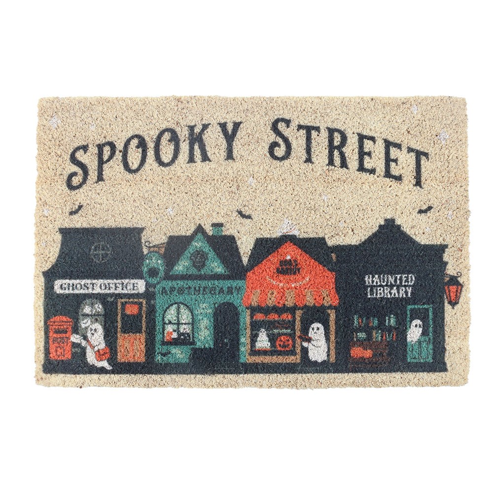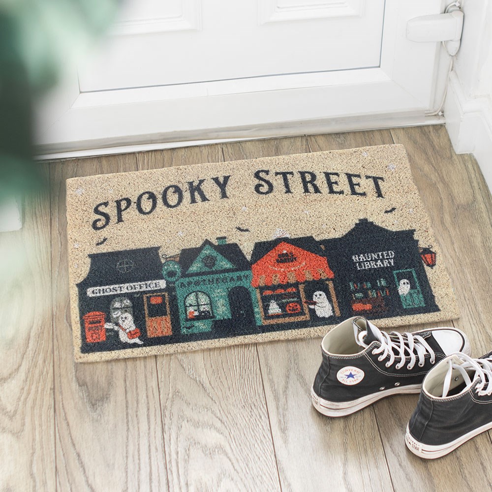 Dê as boas-vindas às crianças que vêm pedir doces com este divertido capacho de fibra de coco «Spooky Street», com uma fileira de casas assombradas peculiares e detalhes fantasmagóricos. Perfeito para dar um toque divertido de Halloween à entrada de casa, é uma excelente decoração sazonal ou presente para os fãs de tudo o que é assustador. Recomenda-se apenas para uso em locais cobertos e interiores. Desenhado pela Something Different Wholesale e parte da coleção «Spooky Street» de presentes divertidos de Halloween e decoração para a casa.