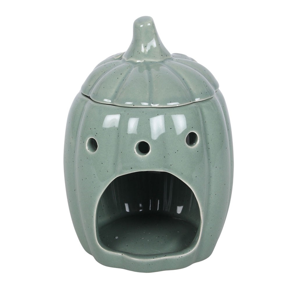 Denna oljelampa i form av en salvia-grön, prickig pumpa med lock har en dekorativ stjälk och fina rankor på locket som ger extra detaljrikedom. Den är ytbehandlad med en glansig glasyr och har en exklusiv prickig effekt, vilket gör den till en stilfull säsongsbetonad inredningsdetalj för hyllor, bord eller höstdekorationer. Den mäter cirka 13,5 cm x 9 cm x 9 cm och är perfekt för doftoljor, doftljus eller vaxsmältor. Placera bara ett värmeljus inuti och tillsätt din valda doft för att sprida en mild doft i rummet. Ett härligt tillskott till höstinredningen eller en omtänksam säsongsbetonad present. Lämna aldrig ett brinnande värmeljus utan uppsikt.
